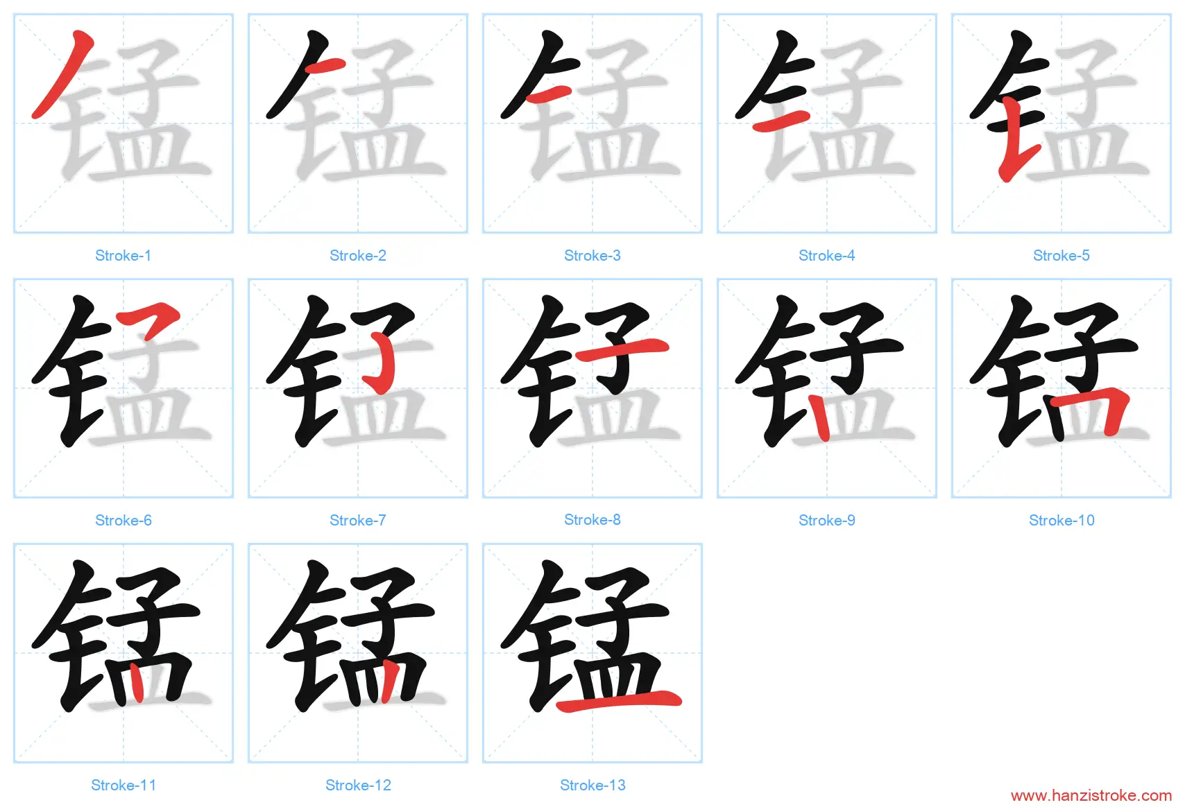锰 (měng): Manganese — Stroke Order & Writing Guide